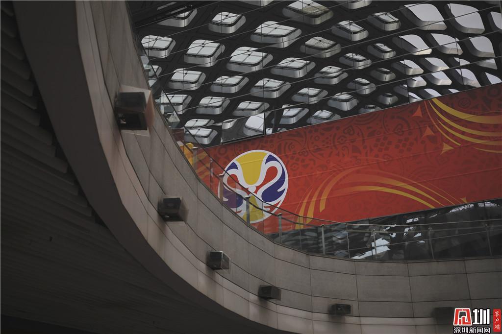 深圳灣體育中心外部,世界杯的logo被布置在玻璃上。