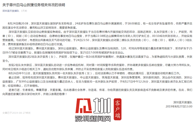 見(jiàn)圳客戶端?深圳新聞網(wǎng)2019年8月30日訊(見(jiàn)圳客戶端、深圳新聞網(wǎng)記者 張玲)8月27日下午,深圳藍(lán)天救援隊(duì)發(fā)布消息稱:8月25日,救援隊(duì)兩名隊(duì)友在掩護(hù)最后一批受困驢友撤離時(shí),突遇溪水暴漲無(wú)法直接下山,為緊急避險(xiǎn)而與大部隊(duì)脫離失聯(lián)。8月27日中午,最終將兩名隊(duì)友找回,經(jīng)確認(rèn),兩名隊(duì)員許挺秀(女)、尹起賀已不幸犧牲。