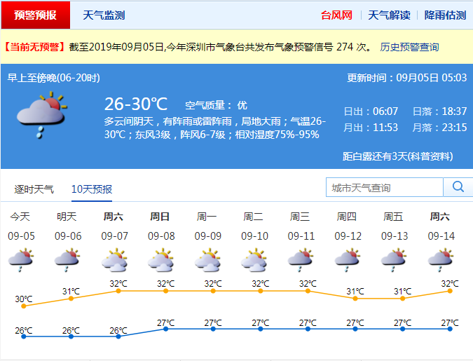 見圳客戶端、深圳新聞網(wǎng)2019年9月5日訊 今年14號臺風(fēng)“劍魚”(熱帶風(fēng)暴級)3日17時減弱為熱帶低壓后,其風(fēng)力進(jìn)一步減弱,已難以確定其環(huán)流中心,中央氣象臺于4日2時停止對其編號。市氣象臺于4日8時30分取消臺風(fēng)白色預(yù)警信號。盡管如此,受“劍魚”減弱后低壓槽影響,今日我市有大雨局部暴雨,沿海、海區(qū)和高地陣風(fēng)6-7級;6日降雨減弱;7日起轉(zhuǎn)多云,有短時陣雨,天氣炎熱。