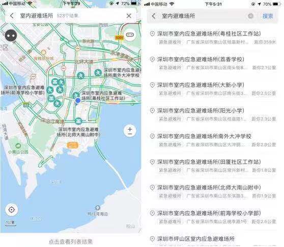目前,深圳市已建成的592處室內應急避難場所位置信息已經標注在騰訊地圖上。深圳市民可在騰訊地圖APP端,或在“騰訊地圖+”微信小程序中,搜索“室內應急避難場所”,獲取附近所有室內應急避難場所的地理位置、名稱、地址、緊急聯系電話等信息,同時可一鍵導航,盡快抵達。