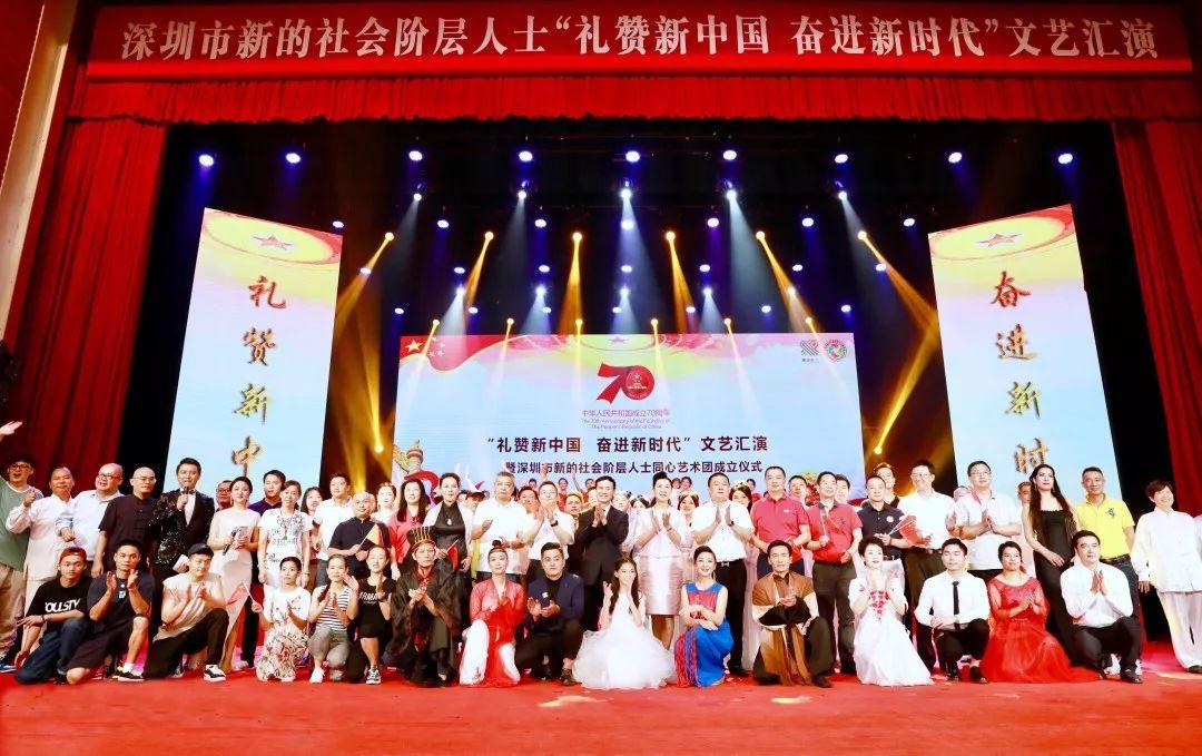 演出前,深圳市新的社會(huì)階層人士同心藝術(shù)團(tuán)揭牌。本次文藝匯演是在市委統(tǒng)戰(zhàn)部指導(dǎo)下,以及各區(qū)統(tǒng)戰(zhàn)部門支持下,由市新聯(lián)會(huì)牽頭,聯(lián)合各區(qū)新聯(lián)會(huì)共同舉辦的獻(xiàn)禮新中國(guó)成立70周年慶祝活動(dòng)之一?,F(xiàn)場(chǎng)氣氛喜慶溫馨,通過(guò)網(wǎng)絡(luò)直播的方式和場(chǎng)外新的社會(huì)階層人士和十多萬(wàn)名觀眾互動(dòng)。