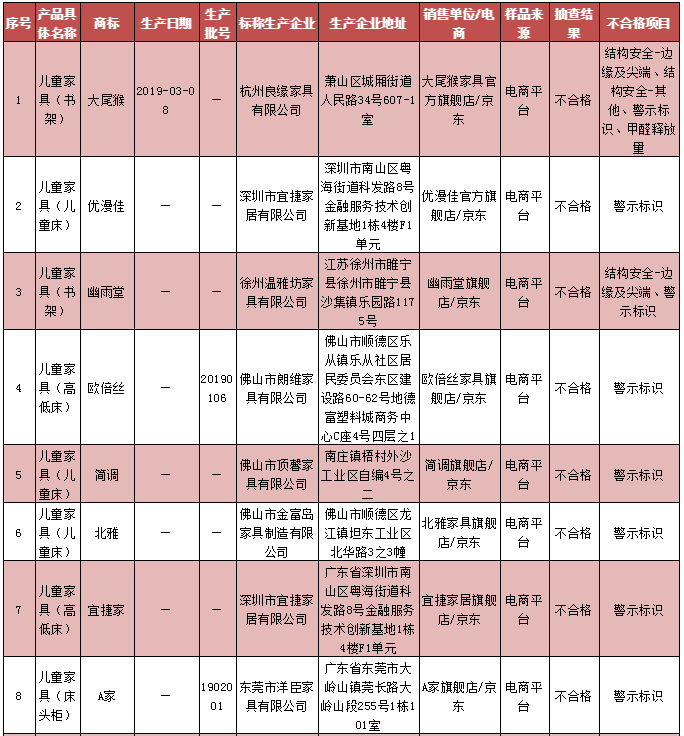 兒童家具產(chǎn)品質量監(jiān)督抽查不合格企業(yè)名單