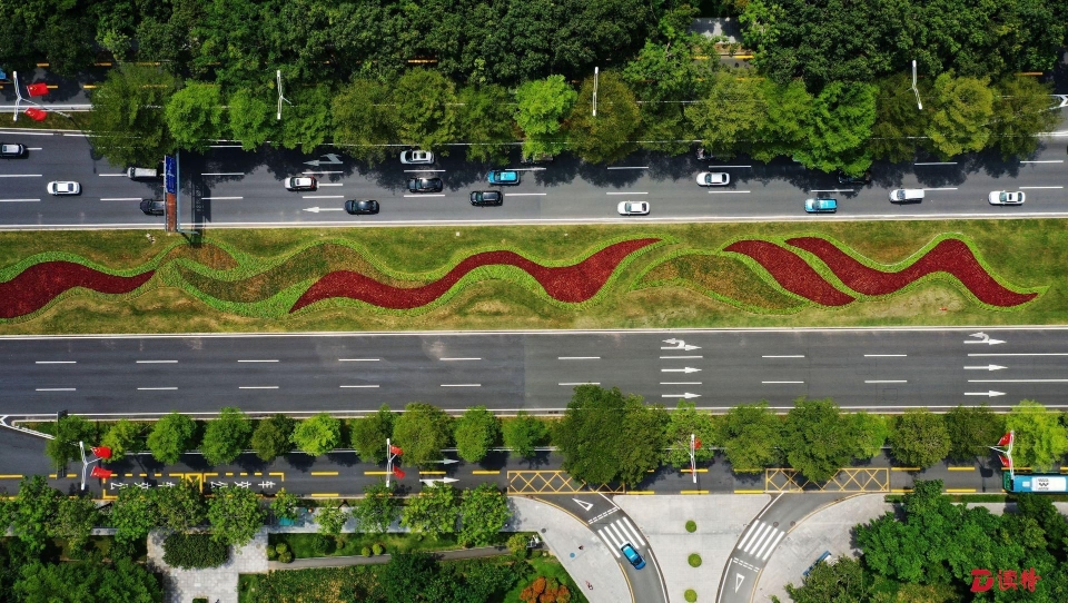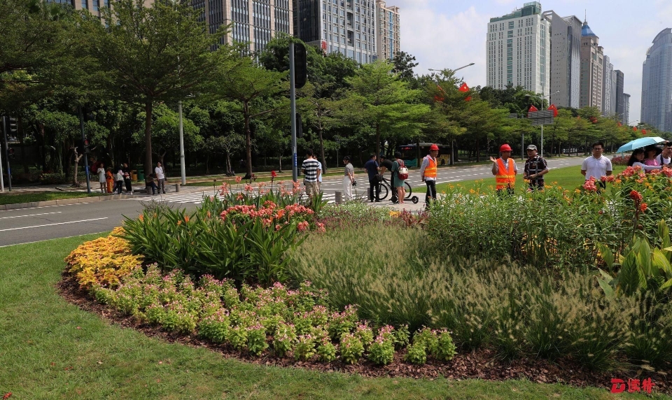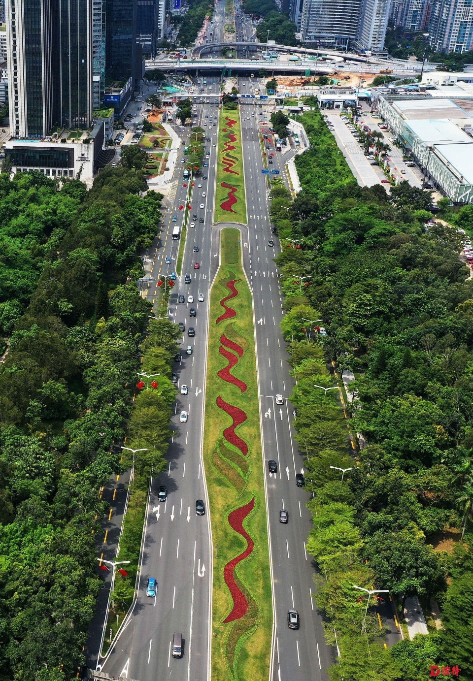 車(chē)輛行駛在深南大道上,沿路多處可以看到綠化工人們正在綠化帶上忙碌著,種植鮮花,修剪草坪,澆水養(yǎng)護(hù)。深南大道東段中間帶上,大紅色的赤壁,搭配藍(lán)色、粉色的大花香彩雀以及白里透粉的夏堇,共同組成了流線型的“鳳凰飛羽”圖案造型。從高處看去,綠化帶與兩側(cè)路燈上懸掛的鮮艷的國(guó)旗交相輝映,濃濃的節(jié)日氣息撲面而來(lái)。