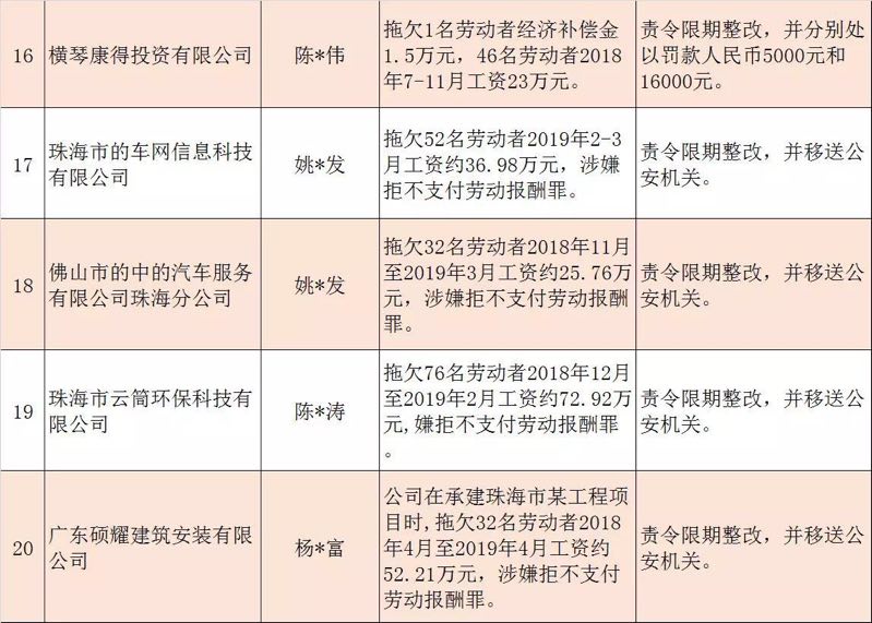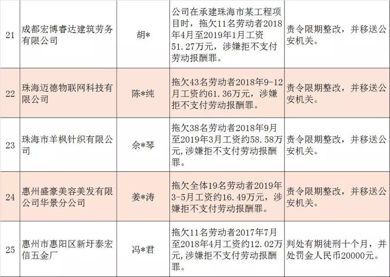 今年第二季度以來,廣東省人力資源社會(huì)保障行政部門繼續(xù)加大對(duì)欠薪等重大違法行為的打擊力度,各地特別是廣州、深圳、珠海、惠州、中山等地對(duì)欠薪逃匿、欠薪屢教不改、欠薪涉及人數(shù)和金額巨大等違法行為重拳出擊,依法處罰處理,對(duì)涉嫌犯罪的堅(jiān)決移送司法機(jī)關(guān)繩之以法,切實(shí)維護(hù)勞動(dòng)者的勞動(dòng)報(bào)酬等權(quán)益。為加強(qiáng)對(duì)違法用人單位的社會(huì)監(jiān)督,強(qiáng)化誠(chéng)信體系建設(shè),加大威懾力,日前省人社廳披露了2019年第三批重大違法案件,這51家黑心企業(yè)中就有10家是深圳“揪”出來的(如圖)。
