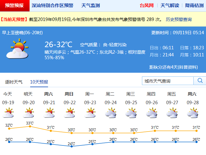 見圳客戶端·深圳新聞網2019年9月19日訊 記者從深圳市氣象局獲悉19日晴天間多云,氣溫26-33℃;20-23日持續(xù)晴熱干燥。其中菲律賓以東洋面的熱帶擾動云團正在發(fā)展,預計其總體趨勢北上,對我市以及華南沿海無明顯風雨影響,但20日前后將受其外圍偏北下沉氣流影響。