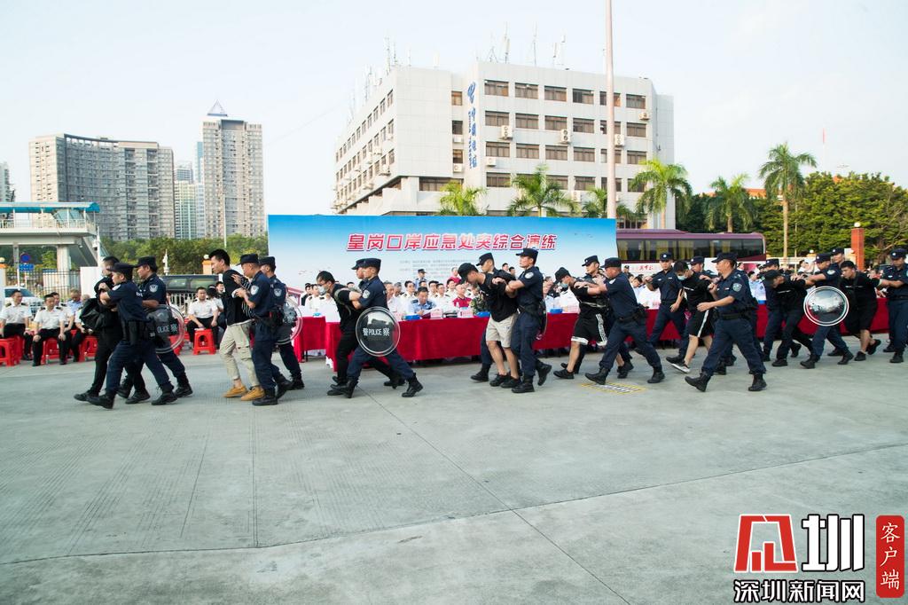 下午5時(shí),隨著演練總指揮福田區(qū)委副書記黃曉鵬一聲令下,演練正式開始。皇崗入境廳,黑衣“不法分子”拒檢、傷人、拉橫幅鬧事,海關(guān)、邊檢呼叫增援……事態(tài)步步升級,觸發(fā)皇崗口岸聯(lián)勤聯(lián)動機(jī)制,根據(jù)應(yīng)急預(yù)案,隨著各項(xiàng)指令有條不紊地下達(dá),皇崗口岸派出所、福田反恐大隊(duì)、武警深圳支隊(duì)、福田交警大隊(duì)、福田急救中心、福田街道武裝部民兵應(yīng)急分隊(duì)、皇崗口岸管理處等聯(lián)勤聯(lián)動力量,迅速趕到現(xiàn)場進(jìn)行處置。在“法律告知”無效、危險(xiǎn)行為繼續(xù)的情況下,警方果斷實(shí)施抓捕,將黑衣“不法分子”一網(wǎng)打盡,在最短時(shí)間內(nèi)恢復(fù)了皇崗口岸的正常秩序。