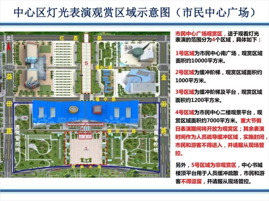 根據(jù)安排,除了福田中心區(qū),南山和寶安區(qū)國慶節(jié)前后燈光表演播放時間從2019年9月20日開始至10月15日每天晚上舉行三場燈光表演。