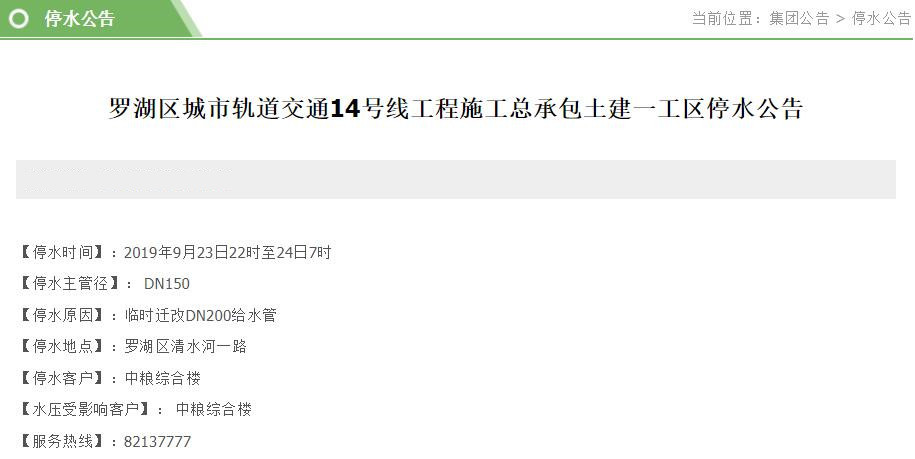 見(jiàn)圳客戶端?深圳新聞網(wǎng)2019年9月22日訊 近日,深圳水務(wù)集團(tuán)官網(wǎng)陸續(xù)發(fā)布停水公告。深圳新聞網(wǎng)記者了解到,9月23-24日,福田、南山、羅湖等區(qū)的多個(gè)小區(qū)和企業(yè)單位將受影響,請(qǐng)市民提前做好儲(chǔ)水準(zhǔn)備。
