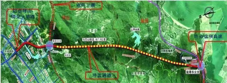 坪鹽通道北起坪山區(qū)現(xiàn)狀錦龍大道坪山大道路口,南至鹽田區(qū)鹽壩高速、鹽港東立交,全長約11.252公里。