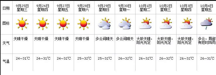 據(jù)市氣象局預計,國慶假期前半段天氣整體晴好 ,看到這一排小太陽超開心的有木有?!