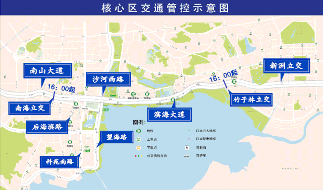 以深圳灣人才公園為中心,濱海大道(南海立交至竹子林立交段雙方向)、沙河西路(濱海大道至東濱立交雙方向)、望海路(東濱立交至中心段雙方向)、中心路(科苑南路至望海路雙方向)、科苑南路(東濱路至中心路段東側(cè))、東濱路(后海濱路至科苑南路段,不含)、后海濱路(濱海大道至東濱路,不含)的合圍區(qū)域?qū)嵤┙煌ü苤?;以及濱海大道東往西方向(竹子林立交至南海立交),西往東方向(南海立交至竹子林立交)實施交通管制。