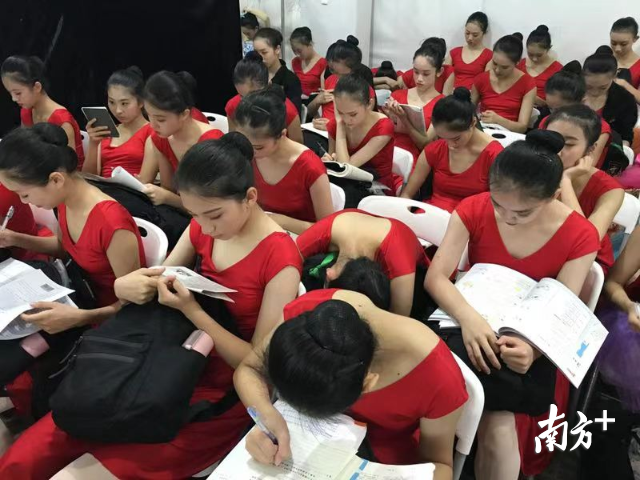 在晚會的另一個彩排候場點,36名來自深圳高級中學舞蹈團的參演學生在彩排和演出間隙仍然抓緊學習。深圳高級中學舞蹈團老師高潔說,這是舞團候場的常態(tài),“為了不耽誤學習,經(jīng)常得抓緊間隙進行學習?!?/p>