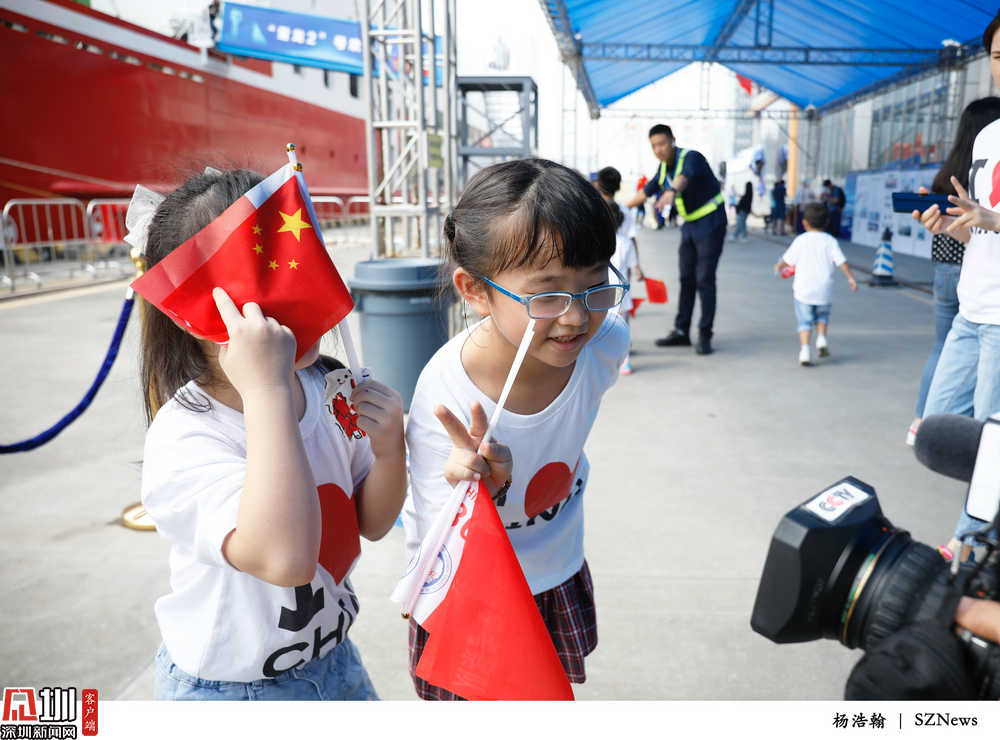 2019年10月14日,蛇口游輪母港CR2碼頭,兩位即將參觀“雪龍2”號(hào)科考破冰船的孩子們對(duì)起鏡頭比起手勢(shì)。