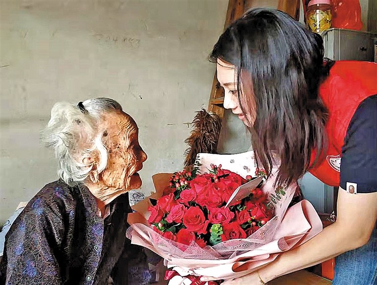 社區(qū)為老人送來慰問品及鮮花
