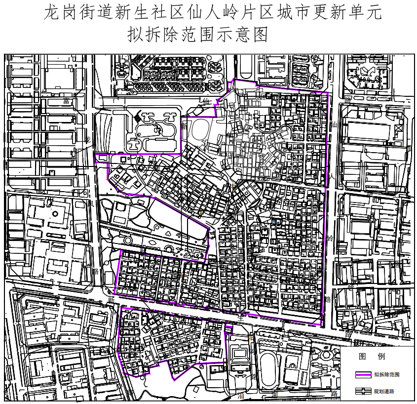 計(jì)劃顯示,更新單元位于龍崗街道,擬拆除重建范圍254136平方米,擬更新方向?yàn)榫幼?、商業(yè)等功能。