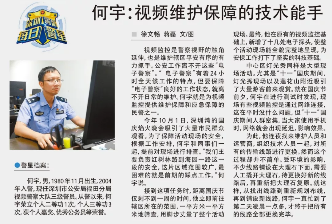 何宇,男,1980年11月出生,2004年入警,現(xiàn)任深圳市公安局福田分局視頻警察大隊(duì)三級(jí)警員。從警以來(lái),何宇榮立個(gè)人二等功1次,個(gè)人三等功3次,獲個(gè)人嘉獎(jiǎng)、優(yōu)秀公務(wù)員等榮譽(yù)。