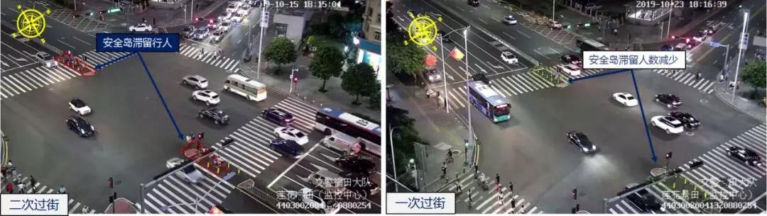 為更好地保障行人過街安全,將蓮花/景田/景田東路口高峰期南北行行人的2次過街方案改為1次過街。調(diào)整后,路口延誤分別為50.1秒、54.9秒,上升了9.6%;中間過街島滯留人數(shù)分別是1300人/小時和242人/小時,下降了81.4%;行人平均等待過街時間分別是70秒和111秒,上升58.6%;東西方向車輛平均排隊(duì)長度由36米增至102米。