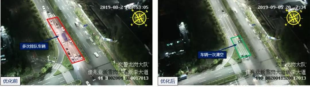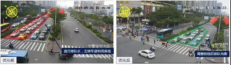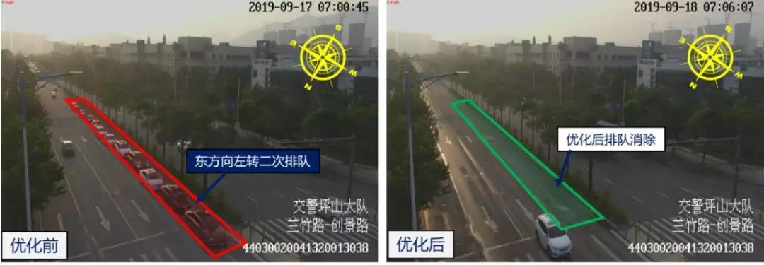 針對這一問題,深圳交警根據(jù)路口各時段、各方向的通勤需求,調(diào)整優(yōu)化了路口紅綠燈配時方案,適當(dāng)增加了擁堵方向時間。優(yōu)化后,路口晚高峰西往東方向車輛排隊(duì)由300多米降至60米左右,下降80%,車輛基本實(shí)現(xiàn)1次通行。