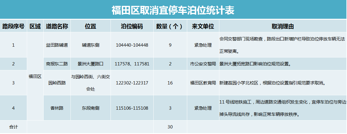 見圳客戶端?深圳新聞網(wǎng)2019年10月28日訊訊 10月28日,深圳市交通運(yùn)輸局、深圳市公安局交通警察局發(fā)布通告稱,將取消福田區(qū)等6區(qū)20條道路共計(jì)338個(gè)宜停車泊位?,F(xiàn)將取消6個(gè)區(qū)部分宜停車泊位情況進(jìn)行公示,市民有意見可于2019年11月26日前反饋。