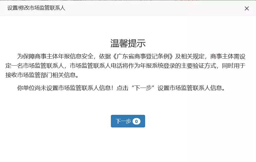 第二步:系統(tǒng)自動彈出市場監(jiān)管聯(lián)系人設(shè)置提示框,閱讀完成后點擊“下一步”。