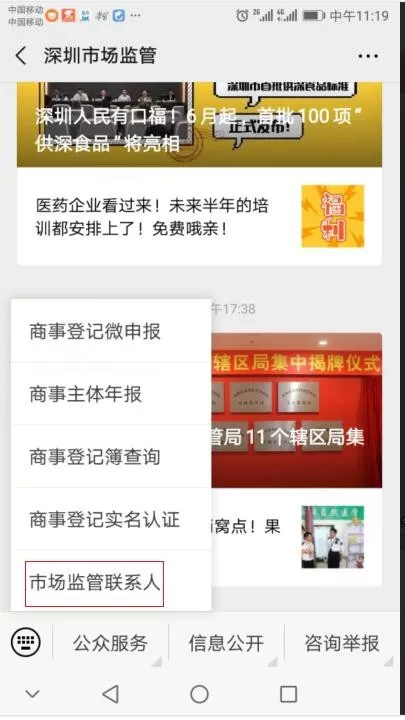 商事主體關(guān)注“深圳市場監(jiān)管”微信公眾號,點擊“公眾服務(wù)-市場監(jiān)管聯(lián)系人”,可設(shè)置、修改市場監(jiān)管聯(lián)系人信息。