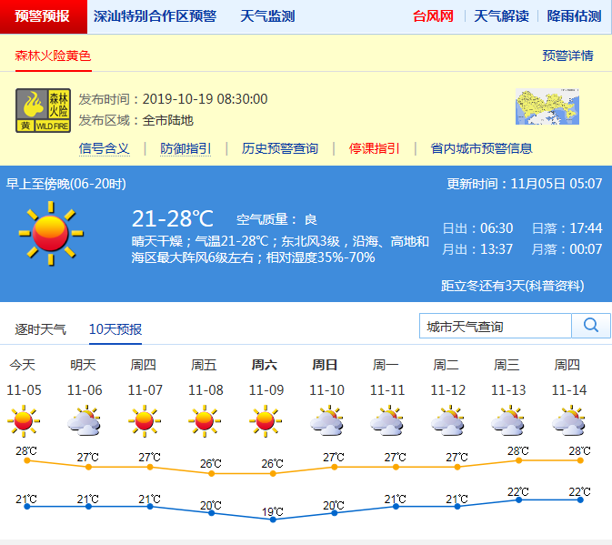 見圳客戶端·深圳新聞網(wǎng)2019年11月5日訊 深圳市氣象局預計5日晴天干燥;氣溫21-28℃;東北風3級,陣風6級;相對濕度45%-75% 。6-10日多云到晴天,空氣干燥,沿海、高地和海區(qū)最大陣風可達7級左右,氣溫小幅波動,1字頭氣溫或?qū)⒃佻F(xiàn)。