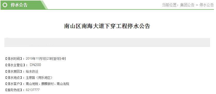 停水客戶:南山地稅、麒麟新村、南山法院