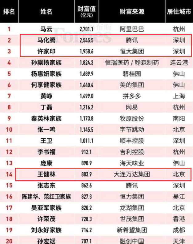福布斯發(fā)布2019中國(guó)富豪榜,馬云馬化騰許家印前三,王健林從去年的第4位跌至第14位