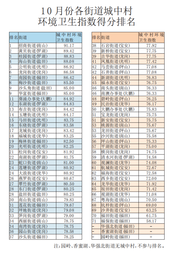10月份,鹽田區(qū)、羅湖區(qū)、光明區(qū)城中村環(huán)境衛(wèi)生指數(shù)得分高于80分,繼9月份后繼續(xù)位列三甲。而坪山區(qū)、寶安區(qū)、龍華區(qū)城中村體量大,得分排名持續(xù)靠后,亟需加大整治力度,迎頭趕上。全市環(huán)境衛(wèi)生面貌最好的3個城中村分別是大磡村(西麗街道)、官田中心村(石巖街道)和玉律村(玉塘街道),得分率超過95%,而環(huán)境衛(wèi)生面貌最差的3個村分別是圍后底村(沙井街道)、景田村(觀湖街道)和鶴藪村(南澳街道),得分率不到50%。