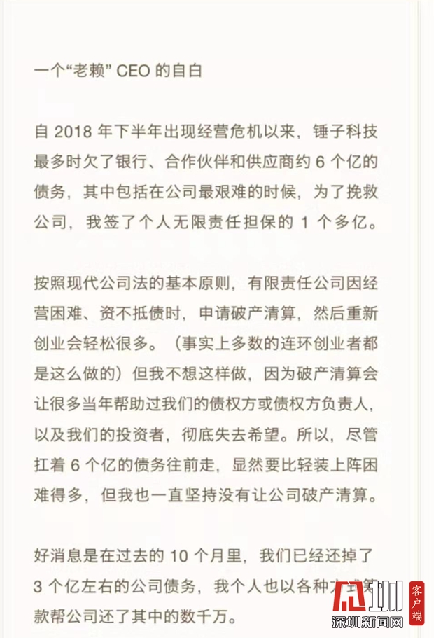 再早幾天,錘子科技CEO羅永浩進入失信人名單,被丹陽法院下了限制消費令。羅永浩隨后在自己的個人公眾號上發(fā)布了《一個“老賴”CEO的自白》,稱自己為了挽救公司,簽了個人無限責任擔保的1個多億,強調會把債務全部還完。