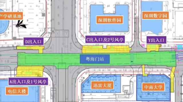 南油站位于南山區(qū)南海大道與登良路交叉口下方,車站出入口共計5個,B出入口位于恒大天璟北側(cè),C出入口位于來福士廣場一側(cè)登良路與南海大道交匯處,D1出入口位于金暉大廈東側(cè),A、D2出入口位于南海大道與華明路交匯處