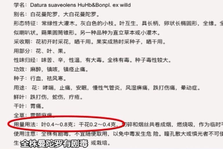 據(jù)了解,曼陀羅又名洋金花,有一定的藥用價值,但也有毒理作用,有多例報道介紹過曼陀羅致人中毒事件。據(jù)相關(guān)資料顯示,曼陀羅葉應(yīng)用藥0.4克至0.8克,干花用藥0.2克至0.4克,使用注意事項提及到,全株曼陀羅有劇毒,不宜隨便取用,以免中毒發(fā)生危險。