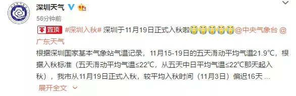 根據(jù)深圳國家基本氣象站氣溫記錄,11月15-19日的五天滑動平均氣溫21.9℃,根據(jù)入秋標(biāo)準(zhǔn)(五天滑動平均氣溫≤22℃,從五天中日平均氣溫≤22℃那天起入秋),我市從11月19日正式入秋,較平均入秋時(shí)間(11月3日)偏遲16天。