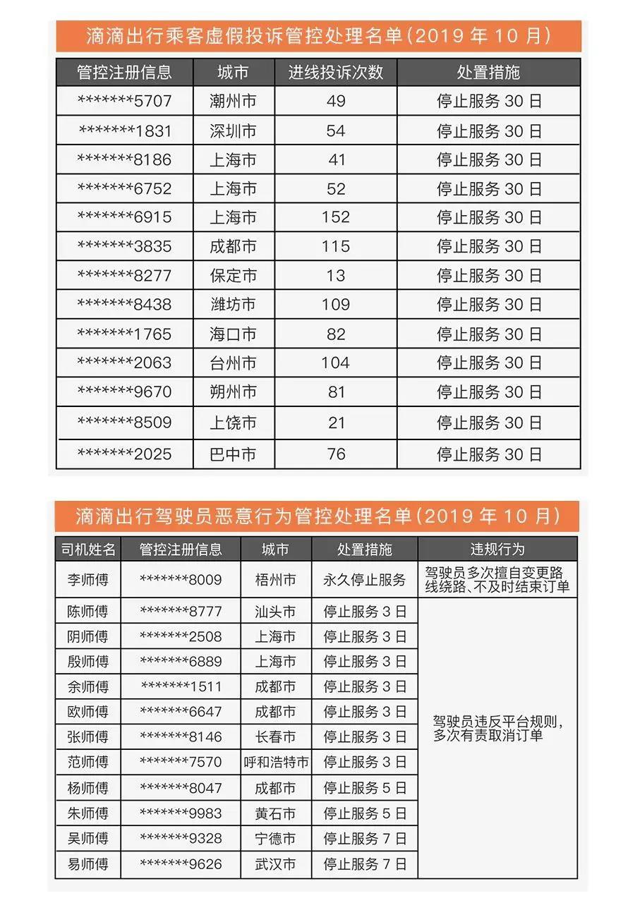 晶報(bào)2019年11月20日訊 11月20日,滴滴出行通過官方微信公眾號對10月違規(guī)司、乘“黑名單”進(jìn)行了公示。乘客黑名單中,惡意投訴次數(shù)最多的高達(dá)152次;司機(jī)黑名單中一位梧州市的李師傅因多次擅自變更路線繞路、不及時(shí)結(jié)束訂單等違規(guī)行為被永久停止服務(wù)。