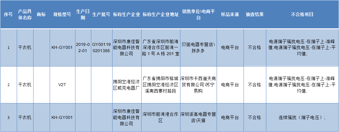 晶報(bào)2019年11月20日訊 近日,江蘇省市場監(jiān)管局對衣物干燥機(jī)產(chǎn)品質(zhì)量進(jìn)行了監(jiān)督抽查,共抽查50批次。抽查結(jié)果顯示,合格30批次,不合格20批次。其中,深圳有3批次不合格。分別是深圳市康佳智能電器科技有限公司生產(chǎn)的2批次干衣機(jī),及揭陽空港經(jīng)濟(jì)區(qū)威克電器廠生產(chǎn)的在深圳市卡西道夫商貿(mào)有限公司、蘇寧易購等電商平臺(tái)銷售的干衣機(jī)。