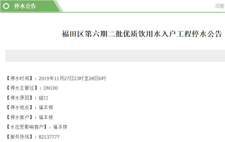 停水時間:2019年11月27日23時至28日6時