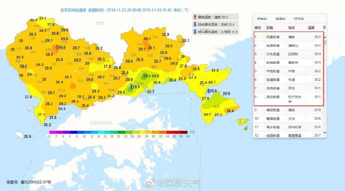 11月24日,深圳大部分地區(qū)最高氣溫在28-29 ℃,有8個(gè)站點(diǎn)破了"3"字頭(這熟悉的黃色圖……)