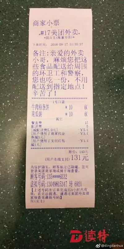 千元外賣(mài)送給環(huán)衛(wèi)工和警察