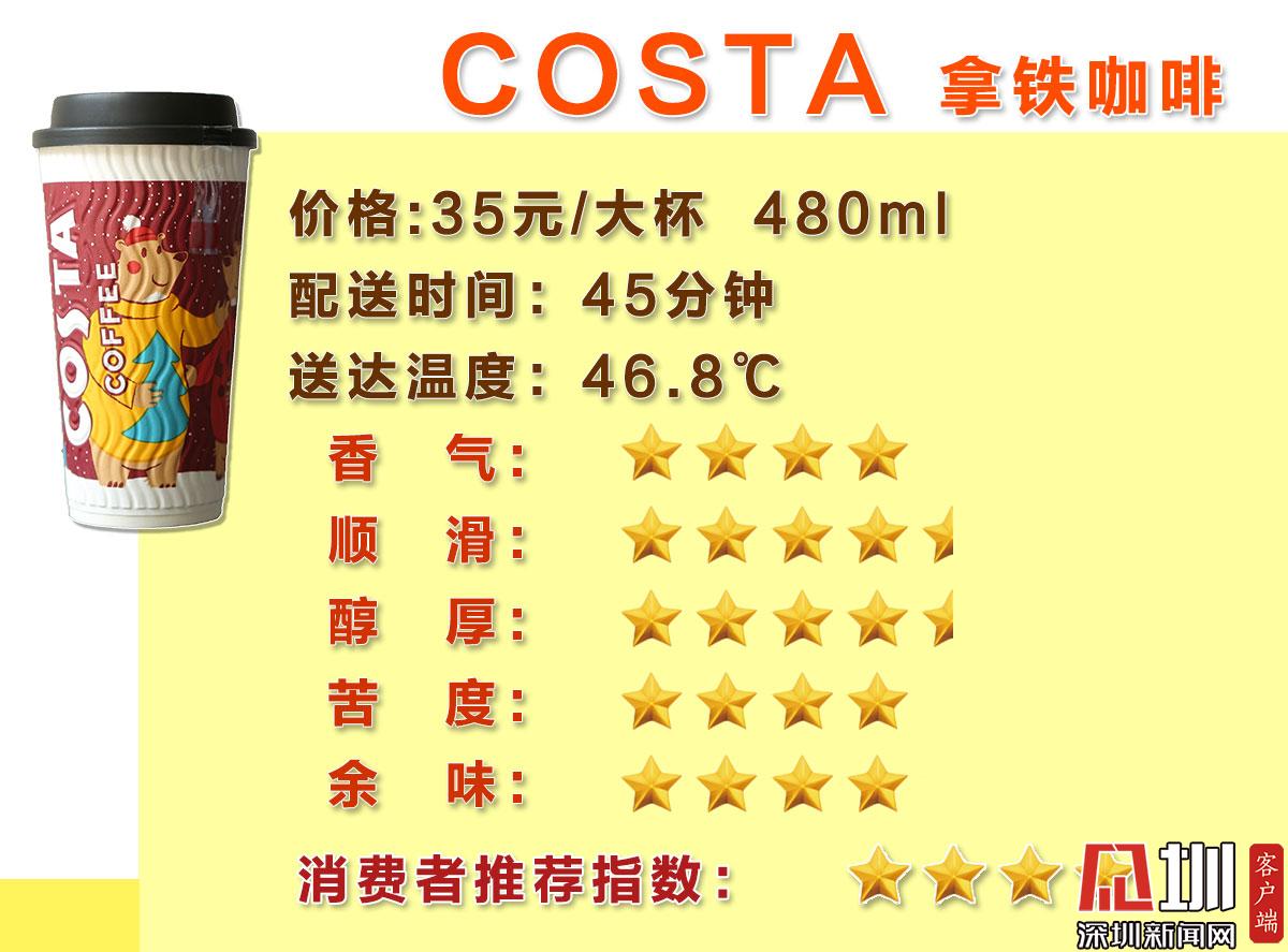 時間及溫度方面,因各品牌咖啡配送距離不一致,該兩項數(shù)據(jù)僅做參考使用。(配送時間段:13:30-15:30)在外賣到達(dá)時第一時間測量溫度并記錄配送時間,具體數(shù)據(jù)如下:星巴克咖啡配送時間為17分鐘,送達(dá)溫度為58.5℃;瑞幸用時29分鐘,送達(dá)溫度為54.4℃;Costa咖啡用時45分鐘送,達(dá)溫度為46.8℃;太平洋咖啡用時45分鐘,送達(dá)溫度為54.5℃。