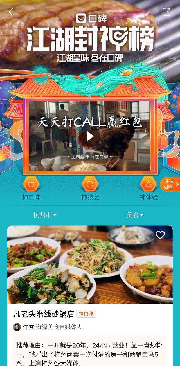 今年“雙12”,口碑餓了么首次發(fā)布“江湖封神榜”,入圍店鋪先由美食體驗(yàn)者、觀察家、媒體團(tuán)在內(nèi)的本地評(píng)審團(tuán)先提名,再經(jīng)過(guò)阿里本地生活大數(shù)據(jù)進(jìn)行智能評(píng)分,同時(shí)邀請(qǐng)眾多消費(fèi)者投票驗(yàn)名“真身“。商戶上榜不靠流量,不用刷單,也不必?fù)?dān)心惡意差評(píng)影響流量和排名。消費(fèi)者就算沒(méi)有本地老餮帶路,參考“江湖封神榜”就能找到地道美食。目前,首批入選的1730家店鋪,分布在北京、杭州、成都、廣州等13座城市。消費(fèi)者通過(guò)口碑a(chǎn)pp上選擇相應(yīng)的城市坐標(biāo),點(diǎn)擊“江湖封神榜”,就可以找到推薦好店。