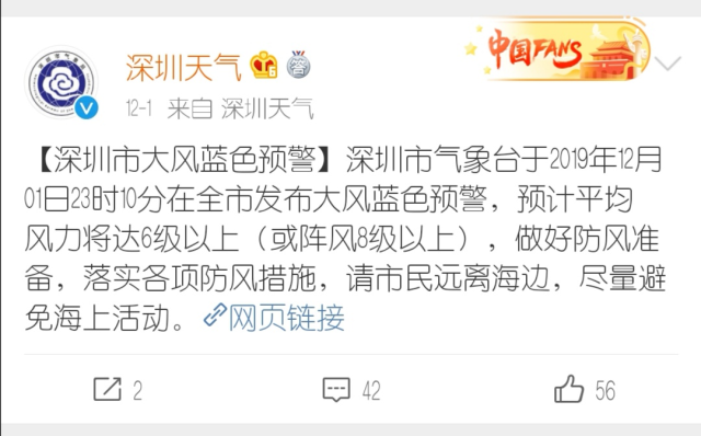 12月1日晚,深圳市氣象局發(fā)布大風(fēng)藍(lán)色預(yù)警: