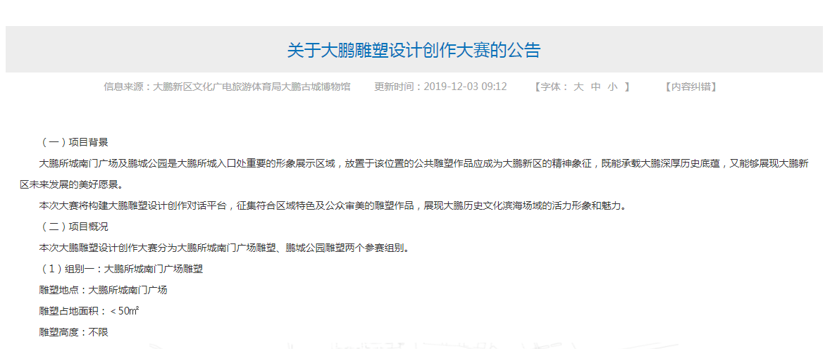 見(jiàn)圳客戶端·深圳新聞網(wǎng)2019年12月3日訊 為了展現(xiàn)大鵬歷史文化濱海場(chǎng)域的活力形象和魅力,12月3日,大鵬新區(qū)文化廣電旅游體育局大鵬古城博物館啟動(dòng)大鵬雕塑設(shè)計(jì)創(chuàng)作大賽,征集大鵬所城南門廣場(chǎng)及鵬城公園雕塑作品,參賽不限單位或個(gè)人,最終每組作品都將評(píng)選出6名獲獎(jiǎng)?wù)?,單?xiàng)最高獲4萬(wàn)元獎(jiǎng)金,總獎(jiǎng)金22萬(wàn)元。