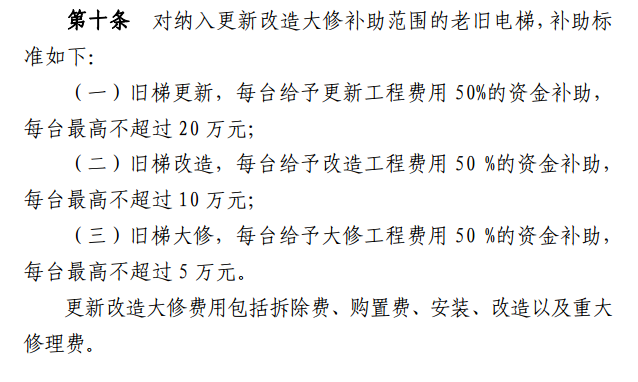 (二)舊梯改造,每臺給予改造工程費(fèi)用50 %的資金補(bǔ)助,每臺最高不超過10萬元;