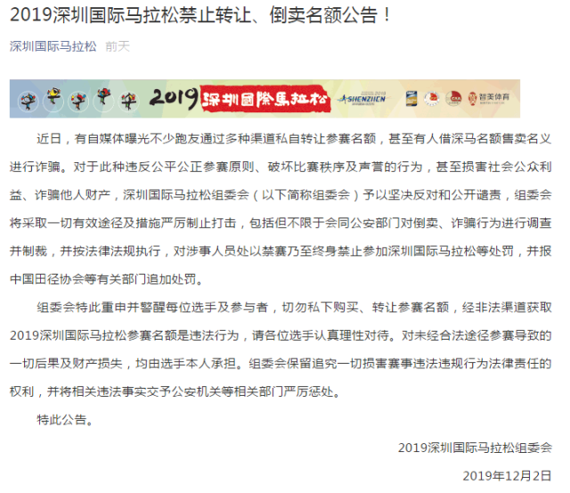 12月2日,深馬組委會(huì)發(fā)布公告,對(duì)于此種違反公平公正參賽原則、破壞比賽秩序及聲譽(yù)的行為,甚至損害社會(huì)公眾利益、詐騙他人財(cái)產(chǎn),深圳國(guó)際馬拉松組委會(huì)(以下簡(jiǎn)稱(chēng)組委會(huì))予以堅(jiān)決反對(duì)和公開(kāi)譴責(zé)。