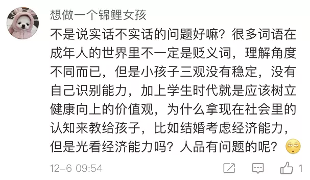 也有網(wǎng)友覺得,出發(fā)點是好的,內(nèi)容在成人看來或許有其“合理性”,但不應(yīng)該拿來這樣教孩子。