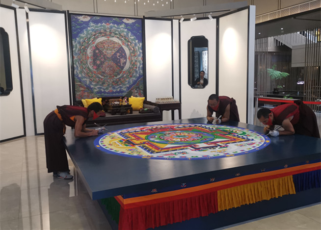 在活動現(xiàn)場,壇城沙畫的現(xiàn)場制作格外引人注目。“一沙一世界,一葉一菩提”——壇城沙畫的過程仿佛一場視覺的盛宴。據(jù)了解,壇城是指對一座宮殿一個世界的泛義,用珍貴珊瑚、瑪瑙、綠松石等礦物質(zhì)研磨成粉,落沙即成畫,畫面立體生動,壇城展示了高度的藝術(shù)魅力和視覺觀感。