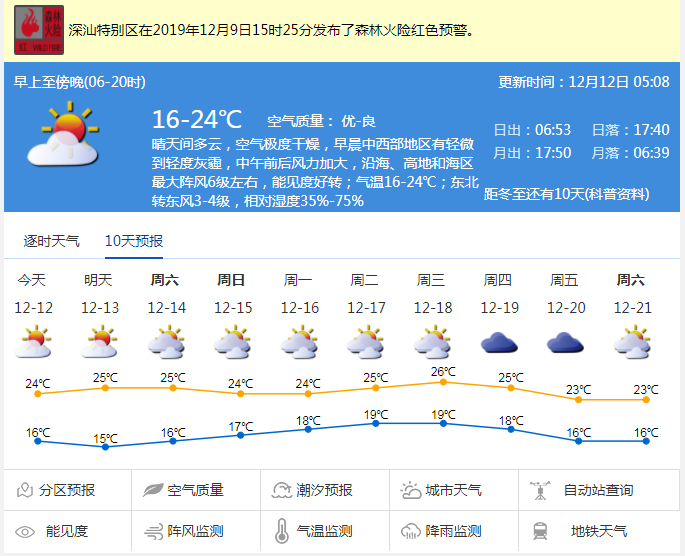 見圳客戶端·深圳新聞網(wǎng)2019年12月12日訊 12日深圳晴天間多云,空氣極度干燥,早晨中西部地區(qū)有輕微到輕度灰霾,中午前后風力加大,沿海、高地和海區(qū)最大陣風6級左右,能見度好轉;氣溫16-24℃。