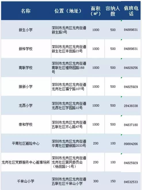 有備無患,也請收好這份龍崗街道各應急避難場所信息表。