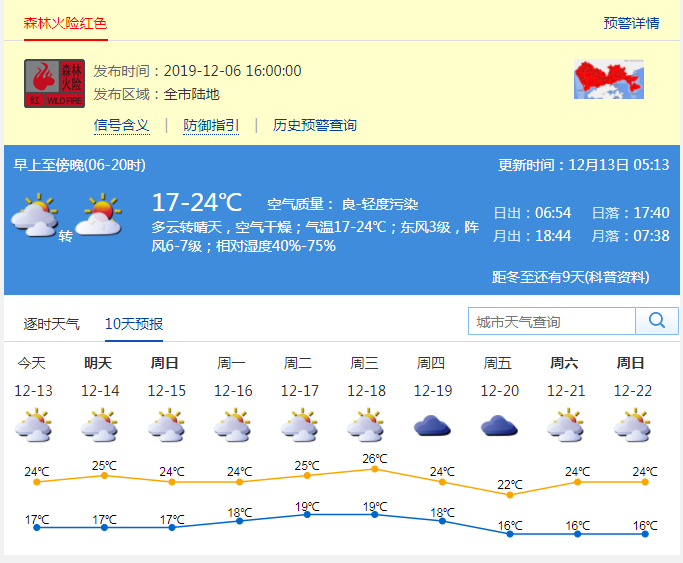 東南風(fēng)3級(jí),東部及沿海陣風(fēng)6-7級(jí);相對(duì)濕度50%-75%;能見(jiàn)度介于6-13公里之間。深圳市森林火險(xiǎn)紅色預(yù)警信號(hào)生效中。日間空氣干燥,注意用火安全及時(shí)補(bǔ)充水分。