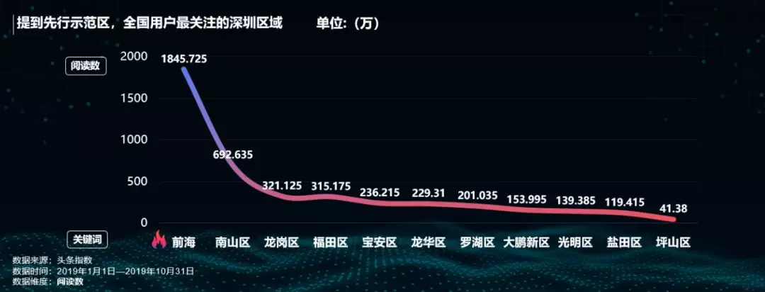 提到先行示范區(qū),全國網(wǎng)友最關注的深圳區(qū)域是前海和南山區(qū)。作為特區(qū)中的特區(qū),前海將奮力成為先行示范區(qū)核心引擎區(qū)域,關注度遙遙領先。而被譽為“中國硅谷”的南山,在科技大熱的今年,關注度僅次于前海。